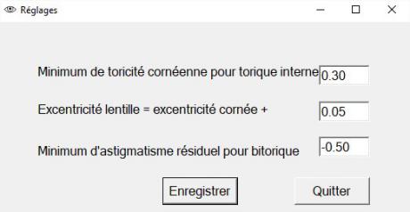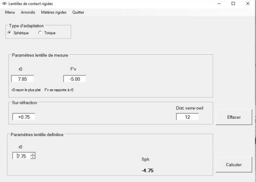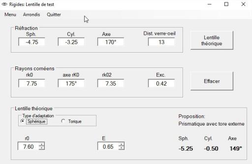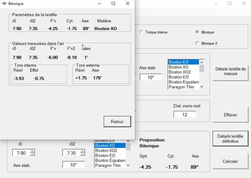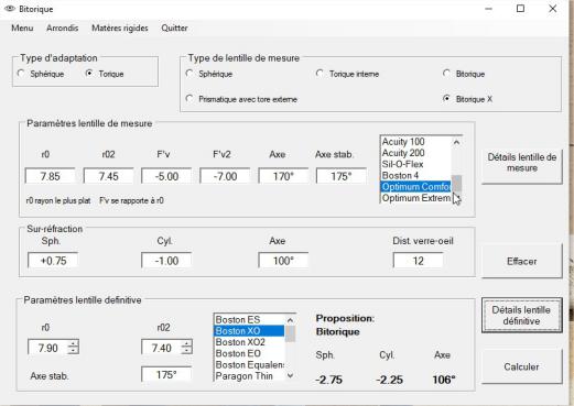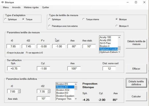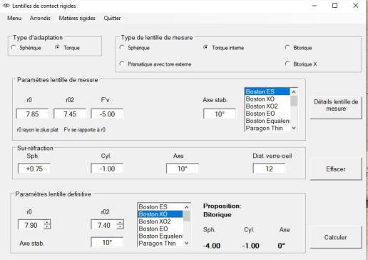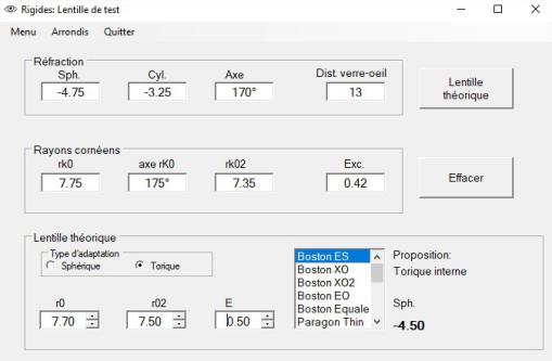 A partir de la réfraction, des rayons cornéens et de l'excentricité moyenne de la cornée, le programme fait une proposition de lentille d'essai sphérique ou torique.