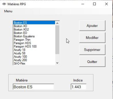 Liste des principales matières rigides du marché. Possibilité d'ajouter ou de supprimer une matière ou de modifier son nom ou son indice de réfraction.