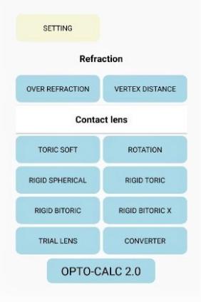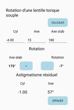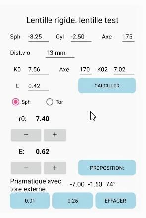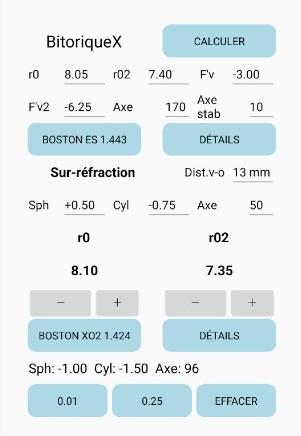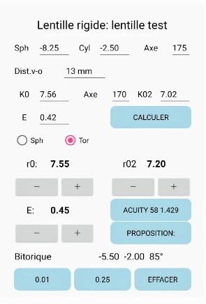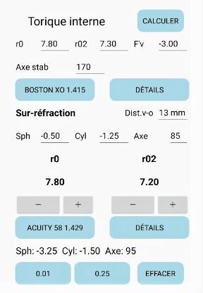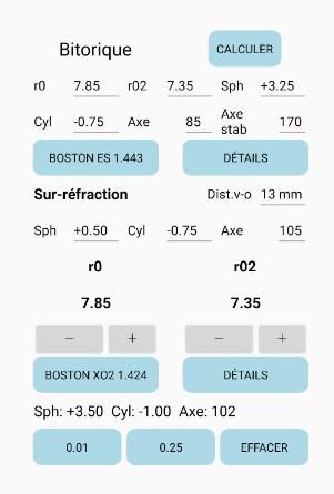 Rigide bitoriqueX : calcul des paramètres d'une lentille rigide torique tenant compte d'une lentille inconnue portée par le patient. A partir de la mesure des rayons centraux de la lentille et de la puissance mesurée au frontofocomètre, de la sur-réfraction, des modifications des rayons centraux et de l'indice de réfraction de la matière.