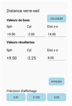 Distance verre-oeil : calcul de la puissance en fonction de la modification de la distance entre la cornée et la face postérieure du verre de lunettes ou par rapport à une lentille de contact (0 mm).