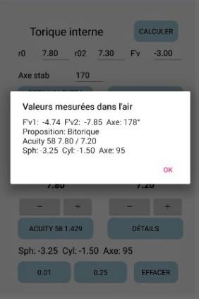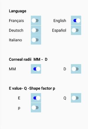 Lentille de test : proposition d'une lentille de mesure rigide en fonction de la réfraction, des rayons centraux de la cornée (mm ou dioptries) et de l'aplatissement moyen (excentricité, Q ou shape p). Les préférences pour ces différentes unités se choisissent dans les réglages. Choix entre une proposition de lentille sphérique ou torique.