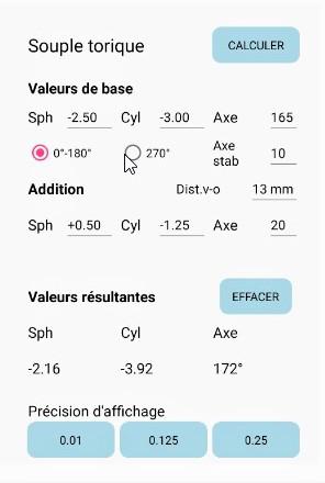Souple torique : calcul de la valeur d'une lentille souple torique après une sur-réfraction. Cylindres négatifs ou positifs. Le résultat est donné en cylindre négatif. Tous les angles correspondent au schéma TABO. Choix entre un marquage horizontal (0°-180°) ou inférieur (270°).