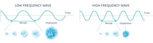 Frequency plays an important role: at low frequency (20-30 kHz) larger bubbles (~ 12 microns) are produced with high power when they implode. This frequency range is suitable for removing heavy soiling. Areas of application: mechanical components, injection molds and engine parts, among others.