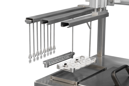 As with ophthalmic lenses, it is possible to automate the entire cleaning procedure by using a multistage system. The dimensions of the device should be reduced to fit easily into the laboratory. It consists of several cleaning and rinsing tanks as well as a filtered air-drying tank. A robot transports the tools containing the lenses to the different vats.
