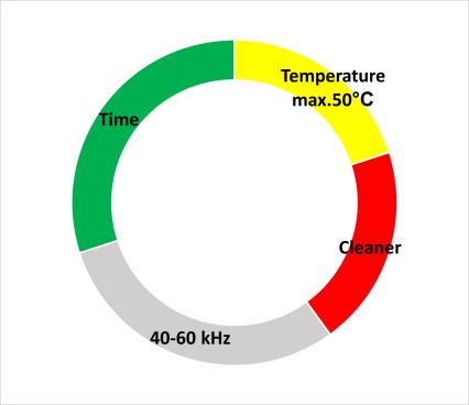 The working temperature should not exceed 50 °C. Above 50 °C there are risks of deformation of certain RGP materials. The ultrasonic tank should incorporate a controlled and monitored heating system prepared to avoid overheating.