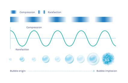 These vibrations produce ultrasonic waves. When these meet an object, the disturbances in the wave train will create a phenomenon called cavitation. A large amount of air bubbles is generated. These bubbles grow during the depression phase and then are compressed during the reverse phase. Their size, which ranges from 1 to 15 microns, depends on the frequency. During these movements of depression and compression the temperature in the bubbles increases until they implode, producing a micro-brushing at the molecular level which removes all the residues on the surface of the part to be cleaned.